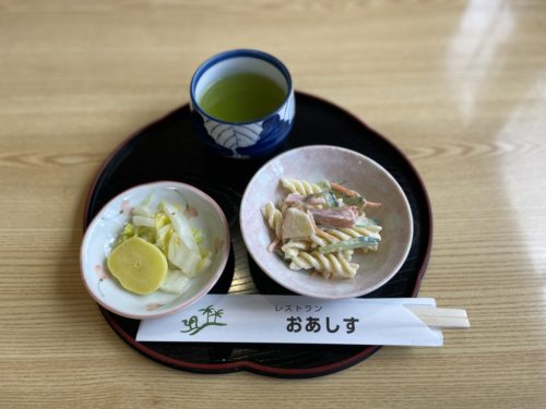 漬物・マカロニサラダ・お茶・箸。箸をつけようか迷います。