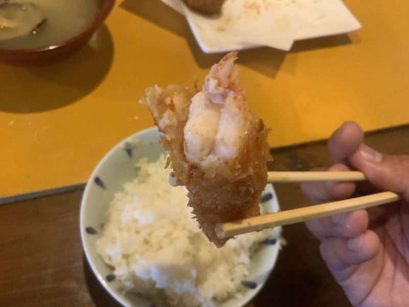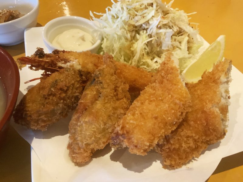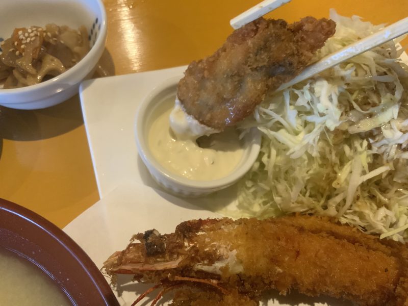 こちらが、「特選かしま定食」。カキフライ、エビフライ、白身フライに、この日はタチウオのフライも加わって超贅沢。