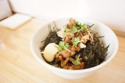 刻まれたチャーシューと刻み海苔が乗っている一品。