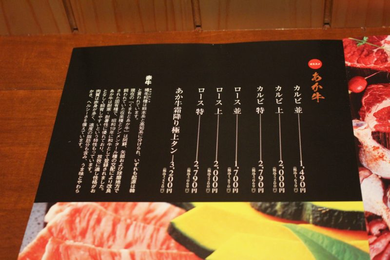 メニューを見ると、まずはメインのあか牛がずらり。すごく食べたい。