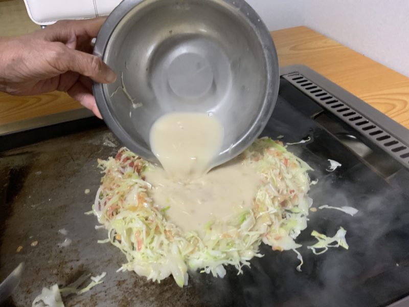 具材をドーナッツ状に焼いて、最後に生地を流し込みます。