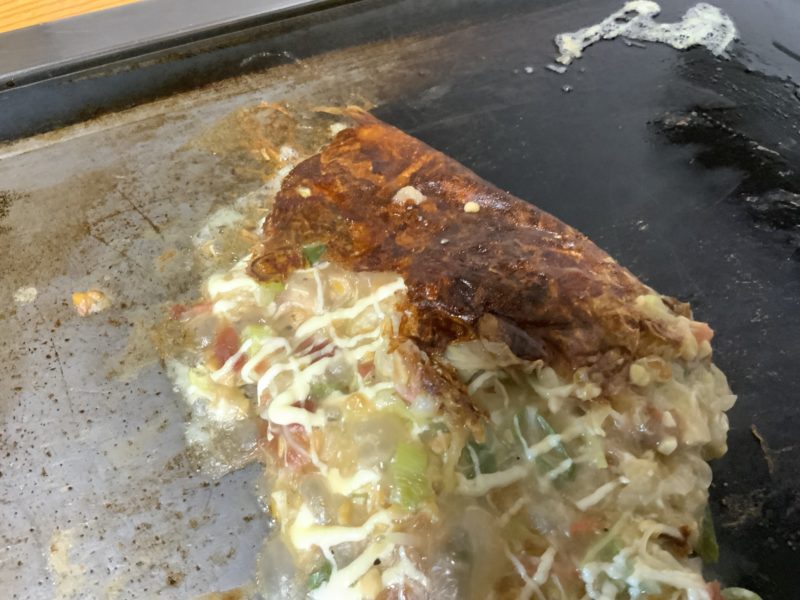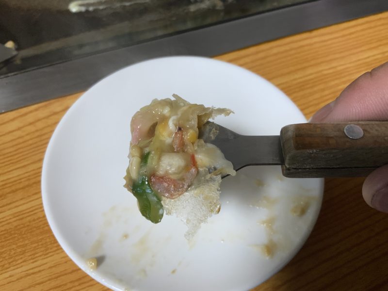 小さなヘラで取り分けて食べていきます。最初はねちゃねちゃしてるだけですが、少しずつ焦げていって、いい感じになっていきますよ。
