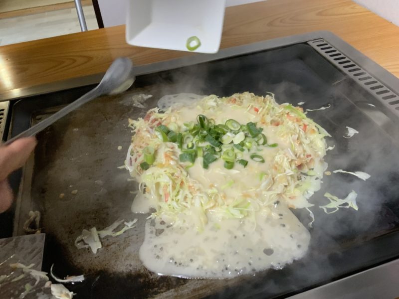 ここで、とろとろの生地を焼きながら食べられるようです。