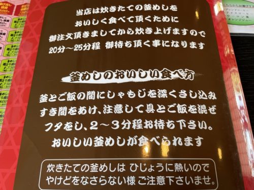 だって釜飯ができるのに、注文してから15分〜25分くらいかかるんですもの。ひとつひとつ丁寧に、釜に熱を入れている証拠です。