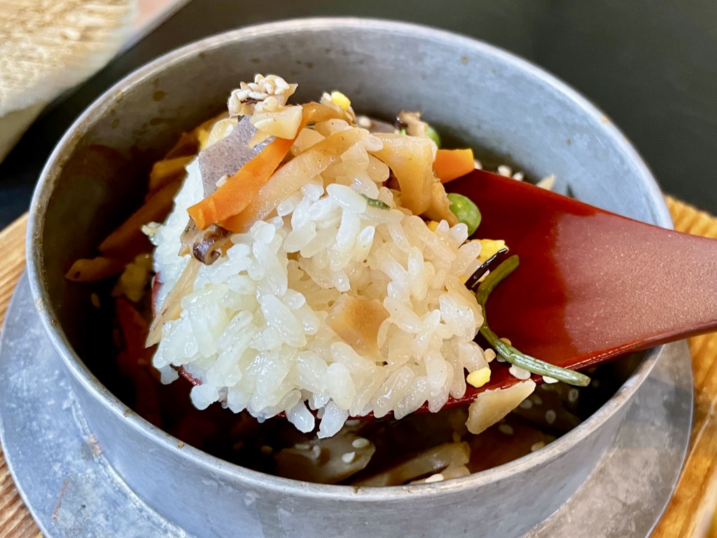 組み合わせをじっくり見てると、時間が経つのを短く感じまして、もう来た釜飯!