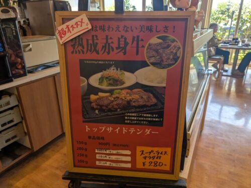 入ってすぐに目に入った看板にも「熟成赤身牛」と大きく書かれていたし、口コミで、ステーキが人気でお肉が美味しいとの情報を得ていたので、迷いはありません。