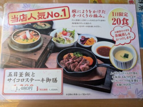 こちらの一番人気は「一日限定20食!五目釜飯とサイコロステーキ御膳」だそう。