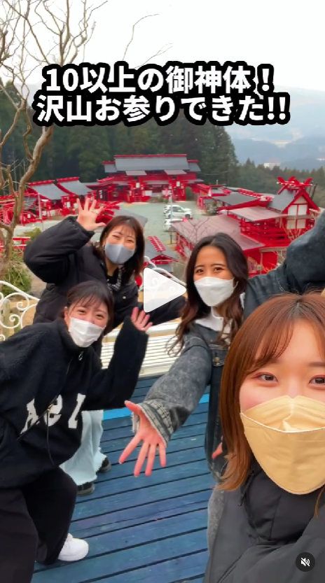 女子大学生がはしゃいでかわいい。賑やかで、神社に光が差すようです。