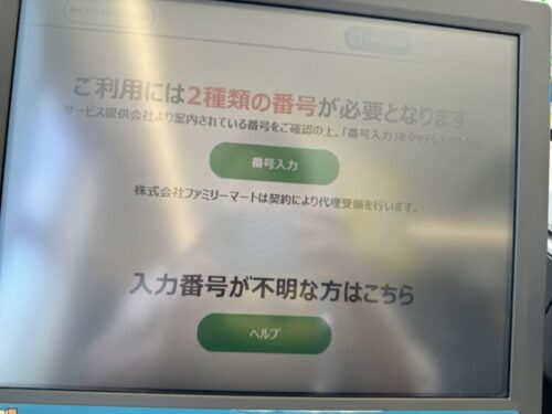 この画面になります。コンビニに設置されてるLoppi(ロッピー)に向かい、チャージ画面から「受付番号」を入力します。