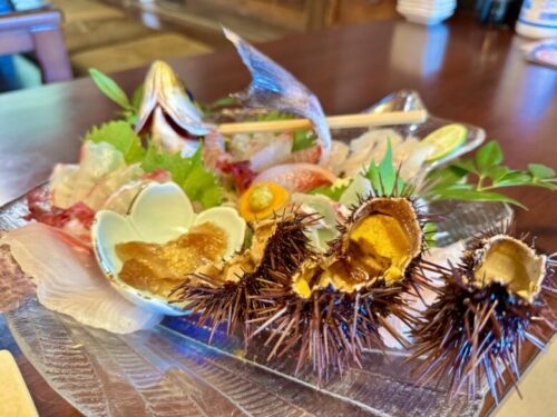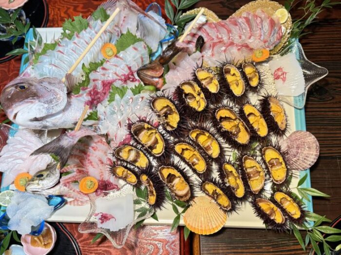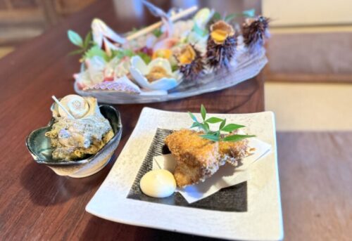 などのお刺身に、サザエと鯛のフライ。街で食ったら1万円くらい?
