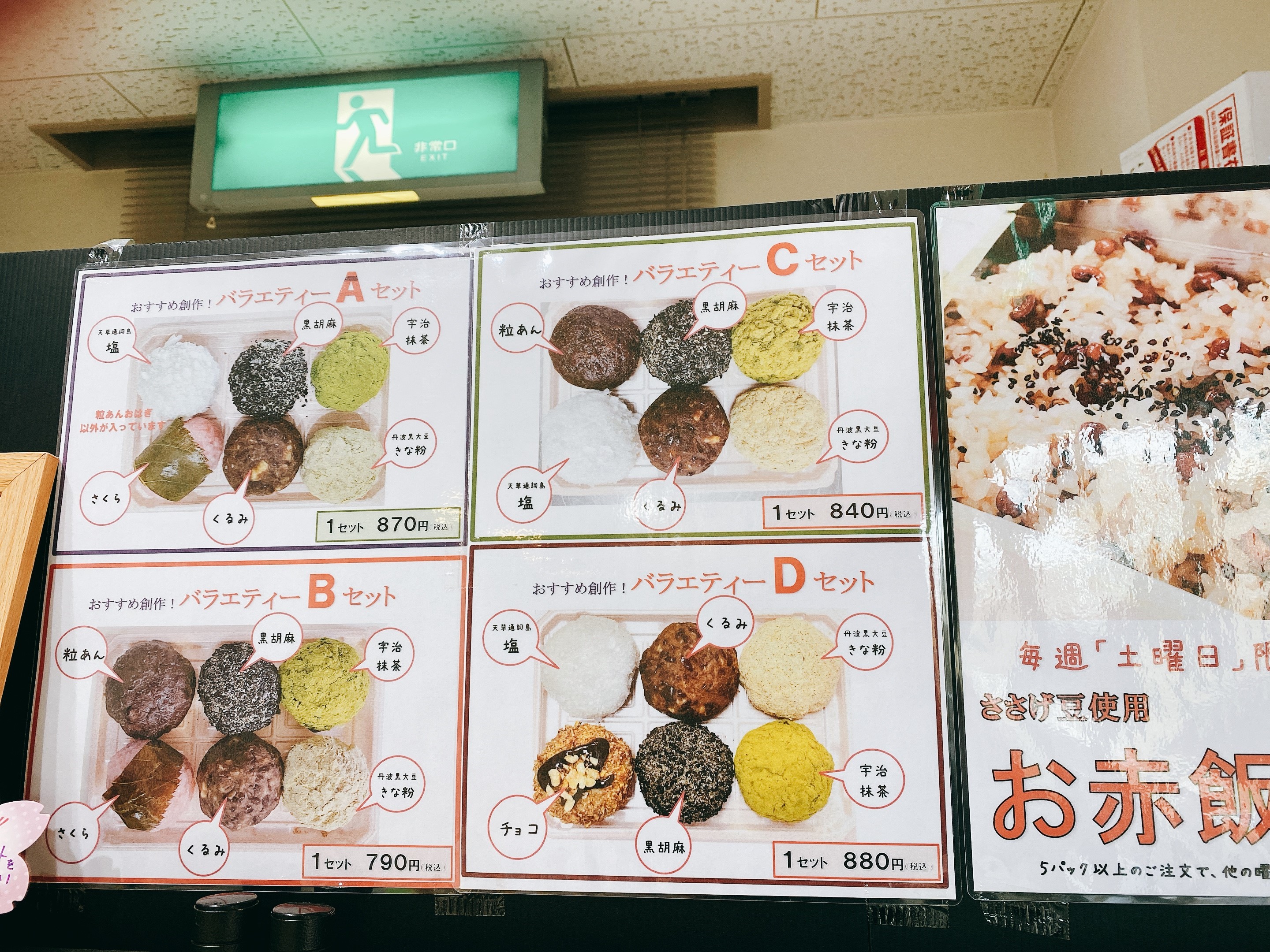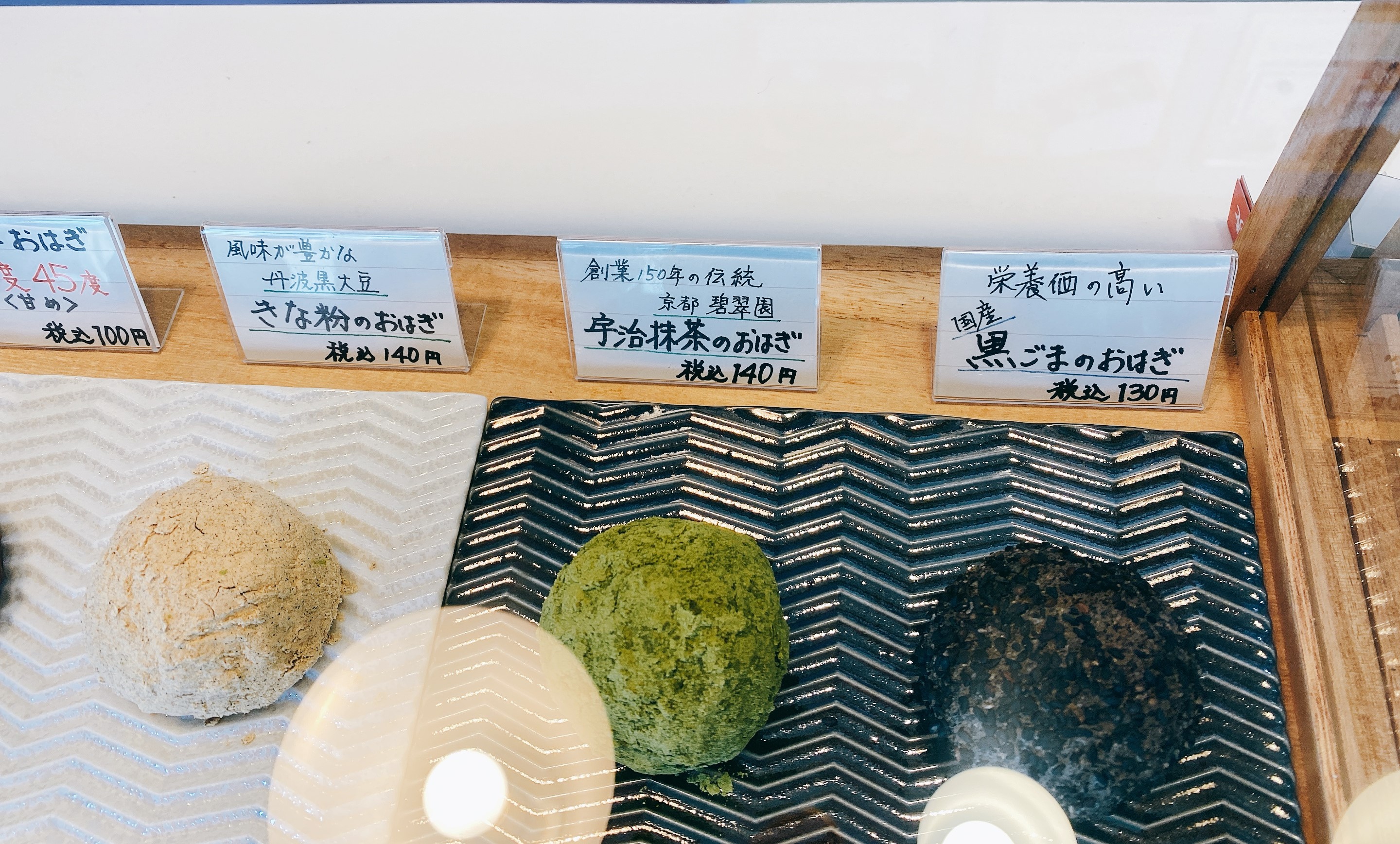 「黒ごまのおはぎ(130円)」「宇治抹茶のおはぎ(140円)」「きな粉のおはぎ(140円)」