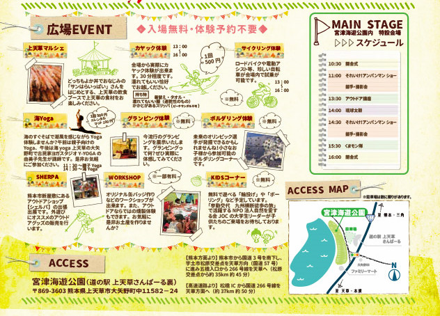広場では、地元上天草の飲食店の出店もあるので天草グルメも満喫できそうです!また、カヤック体験、サイクリング体験、話題のグランピング体験、ボルダリング体験のコーナーもあり、こちらはすべて無料で体験ができます。500円で体験できる海Yogaなどもあり、アクティビティには参加しない方も丸一日楽しめる内容となっています。