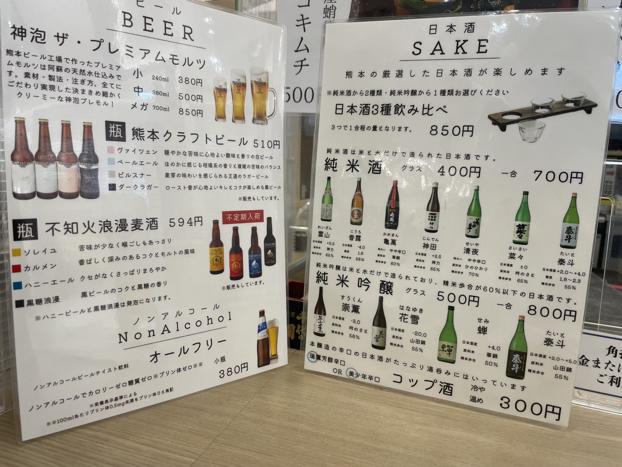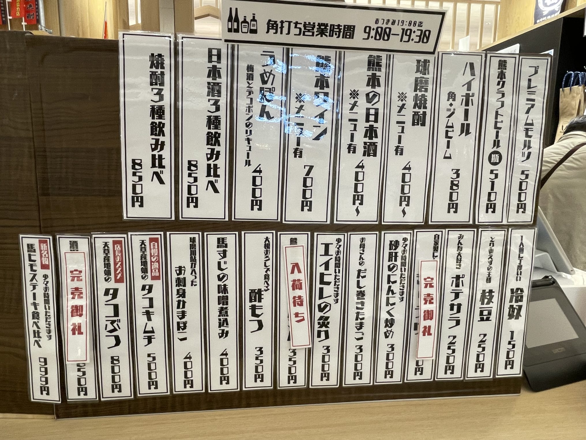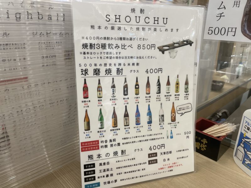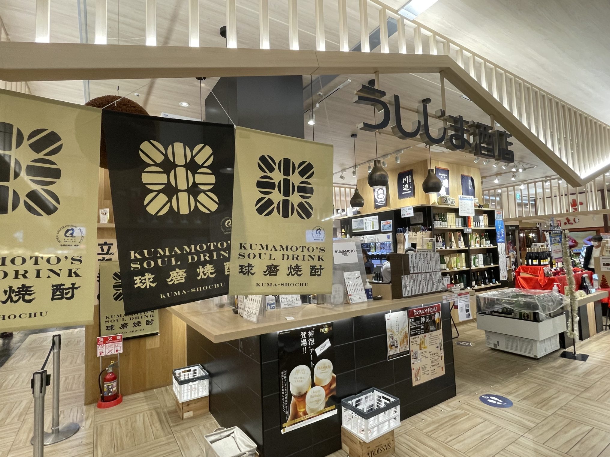 熊本駅よかモン市場内にある「うしじま酒店」。熊本のお酒が多種多様に堪能できるお店です。