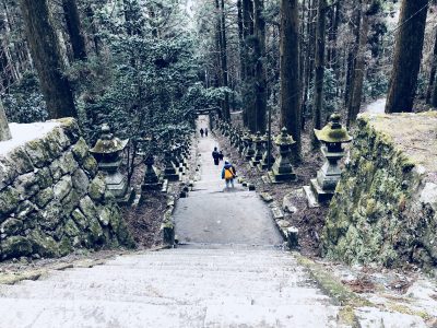 中腹くらいまで行くと2基目の鳥居があり、ここから左にそれるとトイレが設置されています。しかしトイレまでの道中は、日陰のために雪が解けにくいのでツルツルすべる可能性があります。注意が必要です。