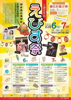 この恵比寿様を祀る神社の大祭が毎年10月20日あります。そして、それとは別に周辺商店街などが恵比寿様を敬う気持ちを込めて、10月6日(土)・7日(日)に「上通並木坂恵比寿祭」を開催しますを