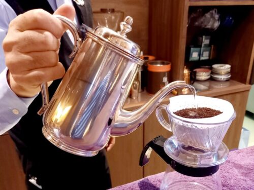 「紫苑珈琲店」では、注文を受けてから豆を挽き、目の前のカウンターでハンドドリップしてくれます。