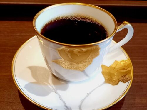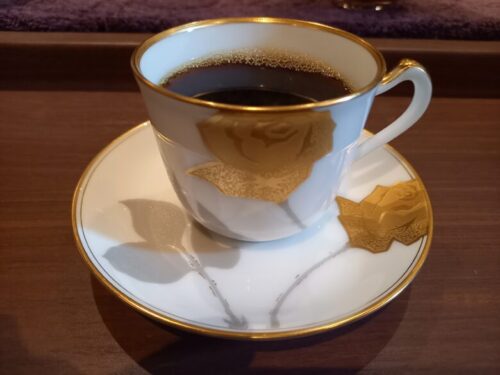コーヒーをいただいたカップは、大倉陶園の「金蝕バラ」