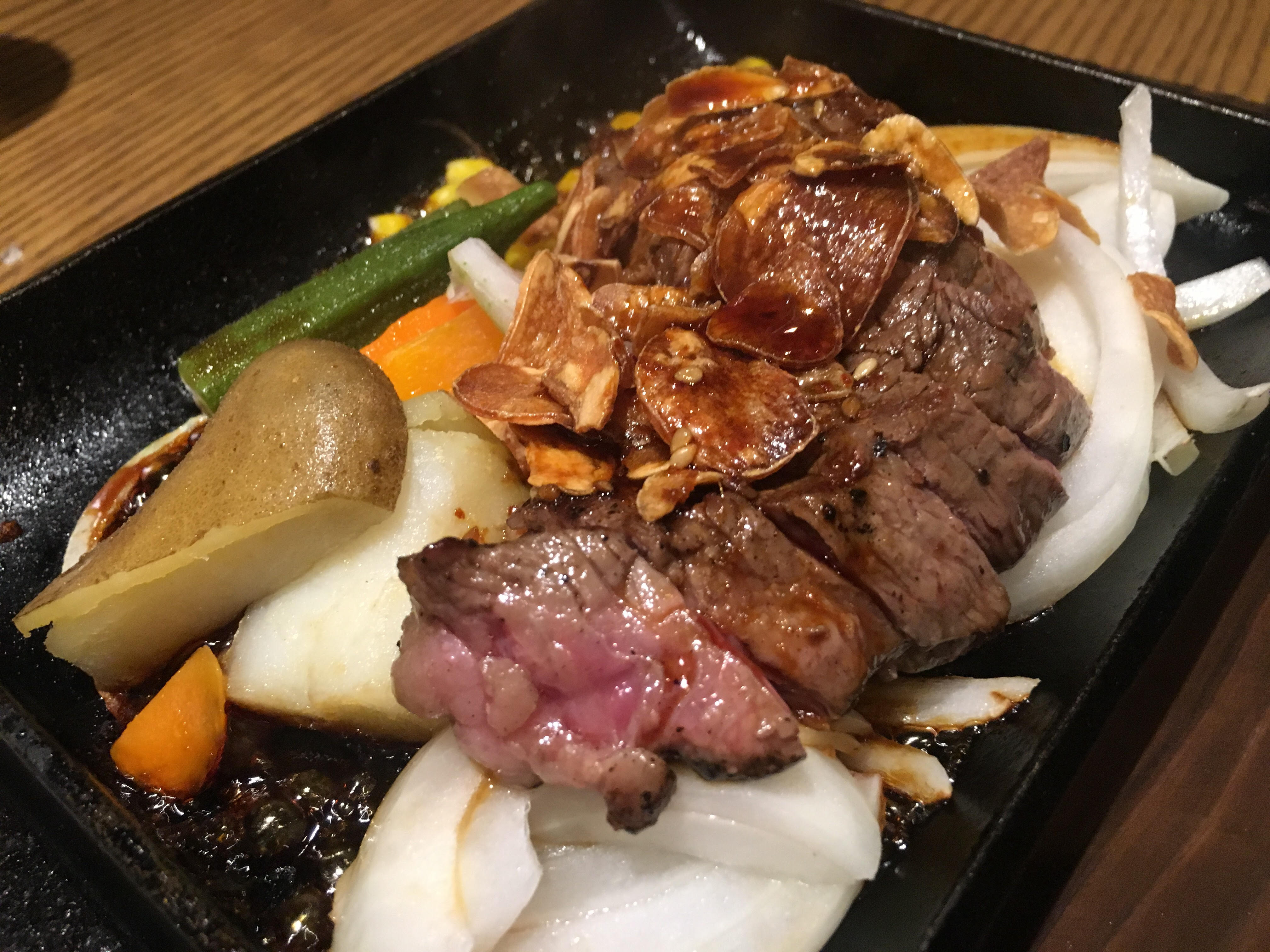 にんにくと醤油だれが香ばしい、熱々鉄板のステーキ、思わず笑みがこぼれるおいしさでした。