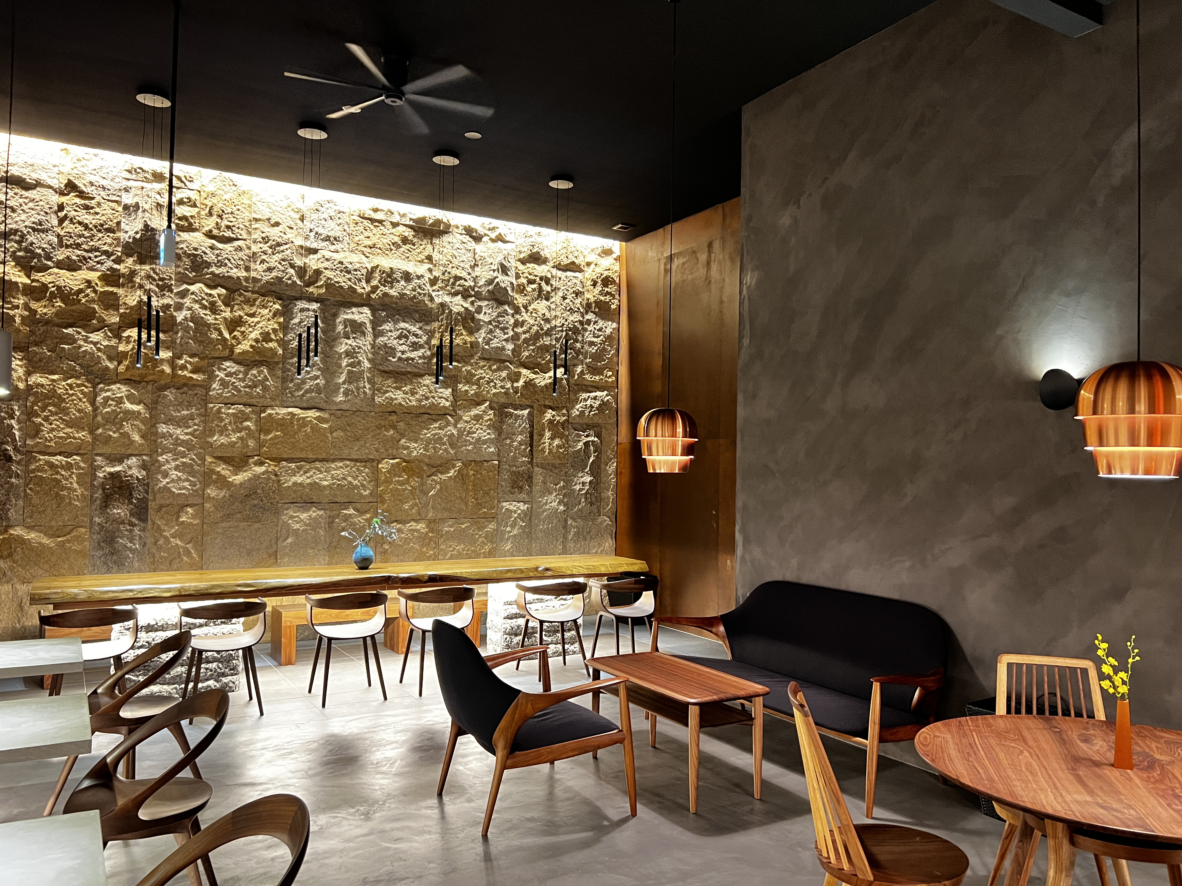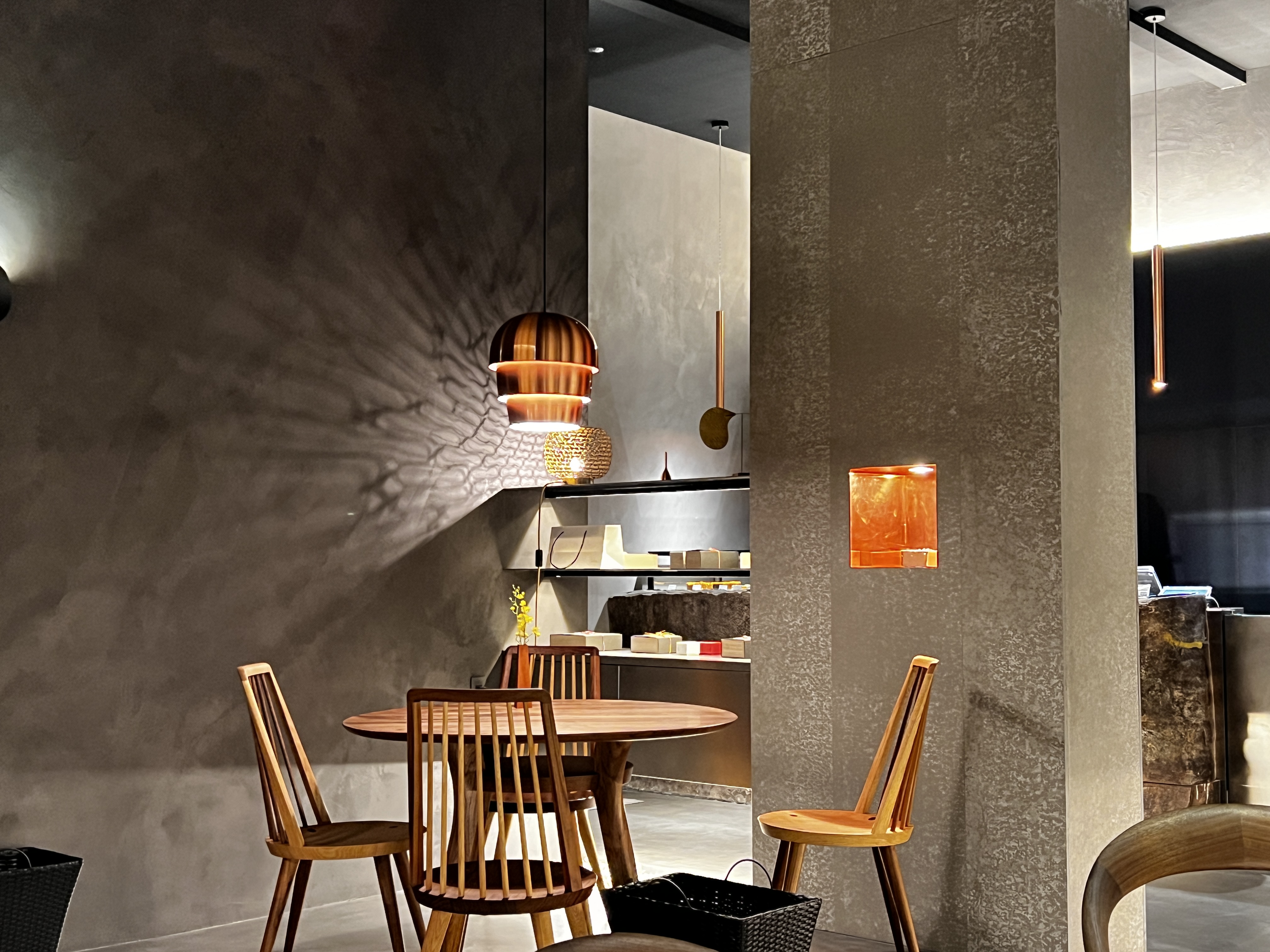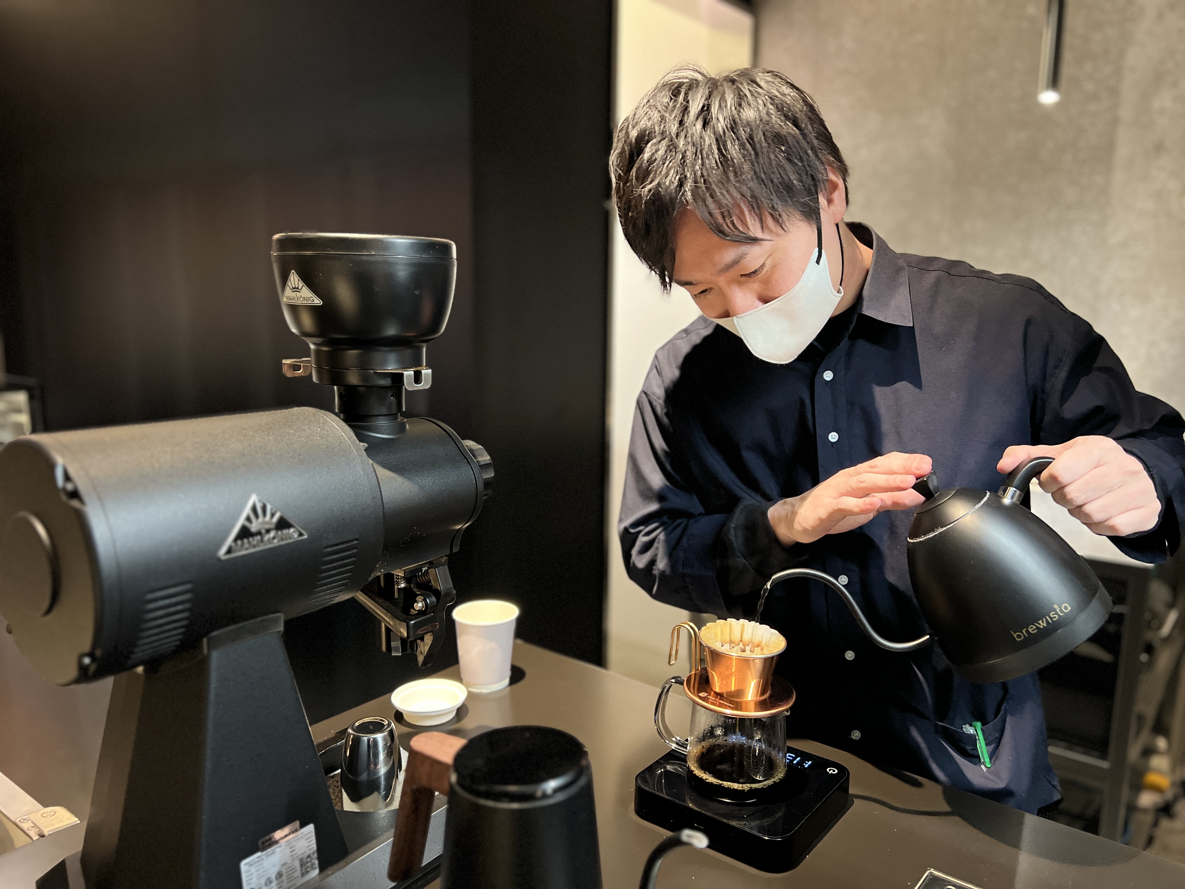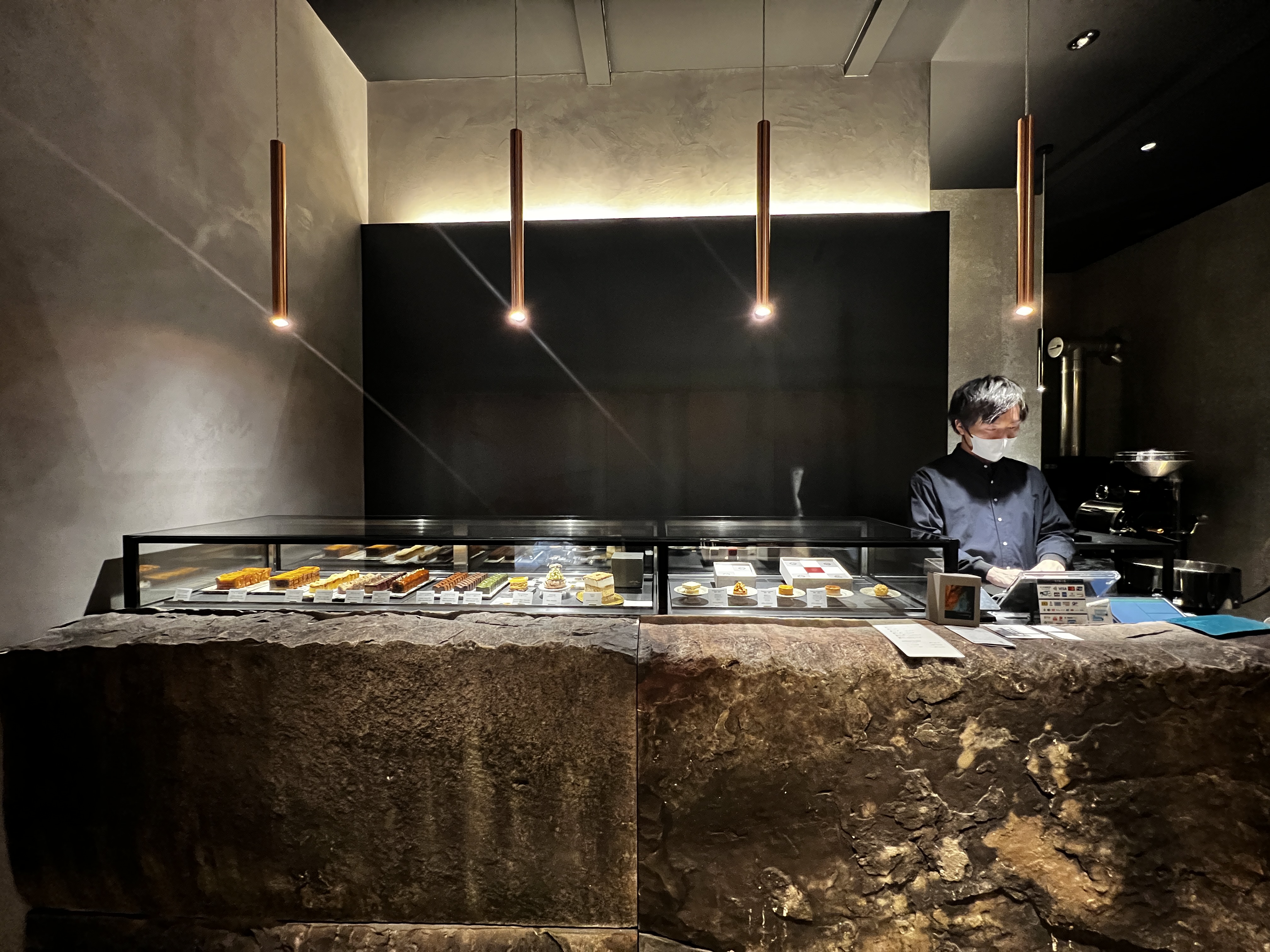 また店内奥のイートインスペースには、岩壁やコーヒーを淹れる器具にも使用される銅板で出来た壁・木製のテーブルにモールテックスという左官材を塗ったモルタル調のテーブルなど様々な空間演出が施された面白さ。