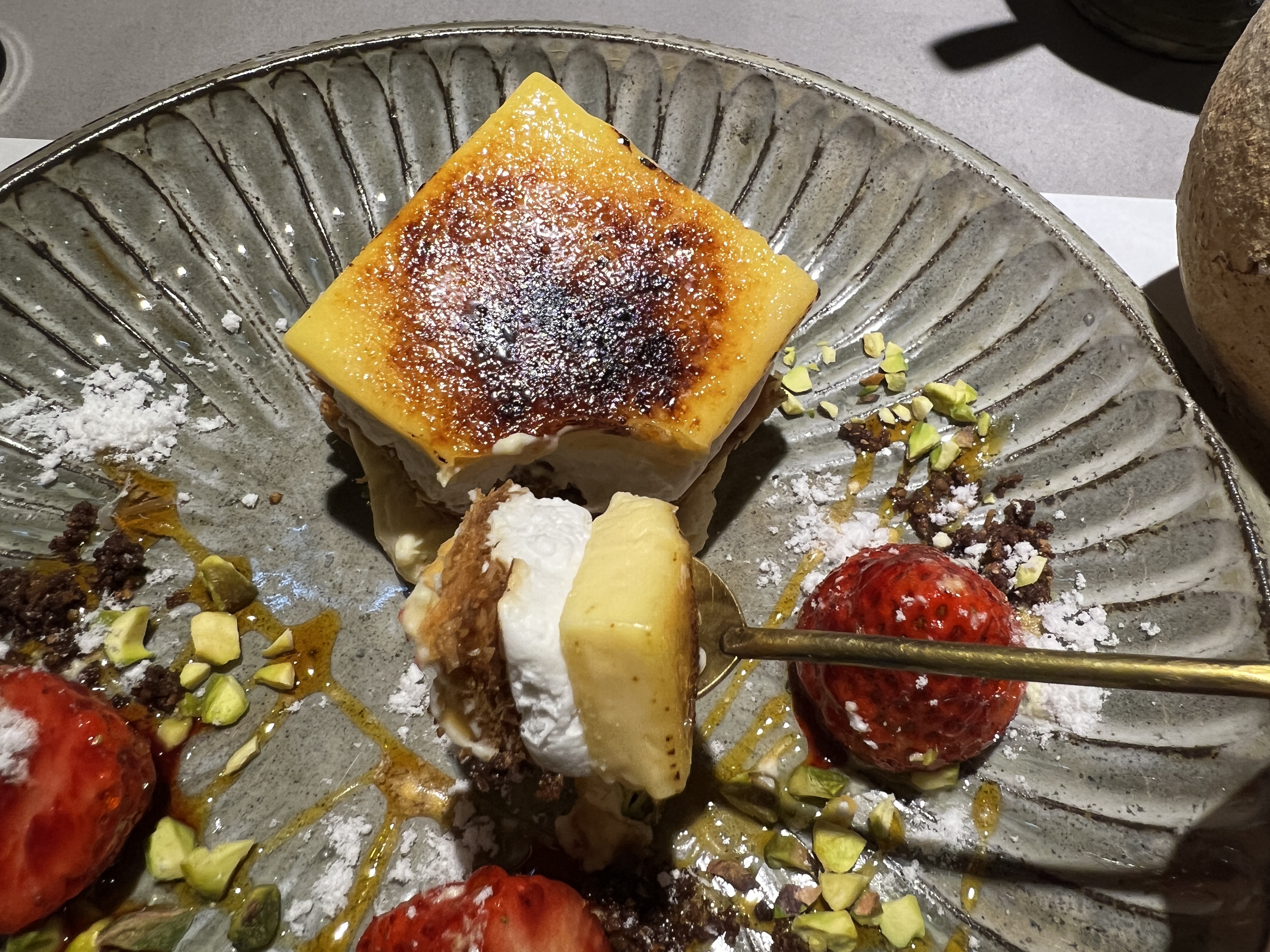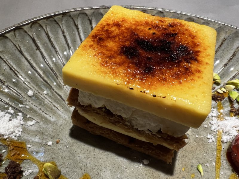キャラメリゼされた表面をパリパリっと割って、バターの香りがするパイとクリーム、コクのある味わいのカソナード(さとうきび100%フランス産ブラウンシュガー)を使ったクリームブリュレの3層を一口で味わう贅沢。