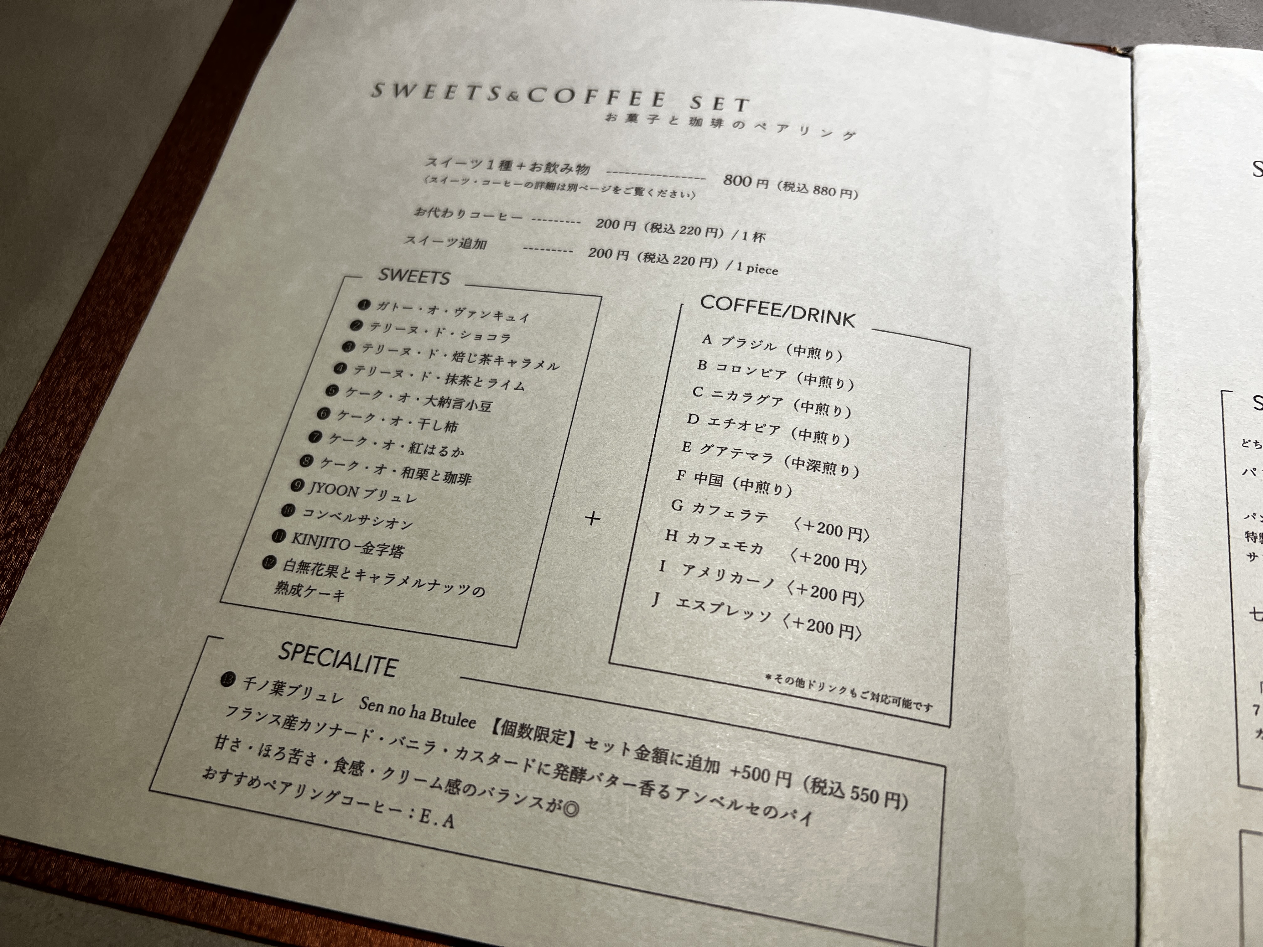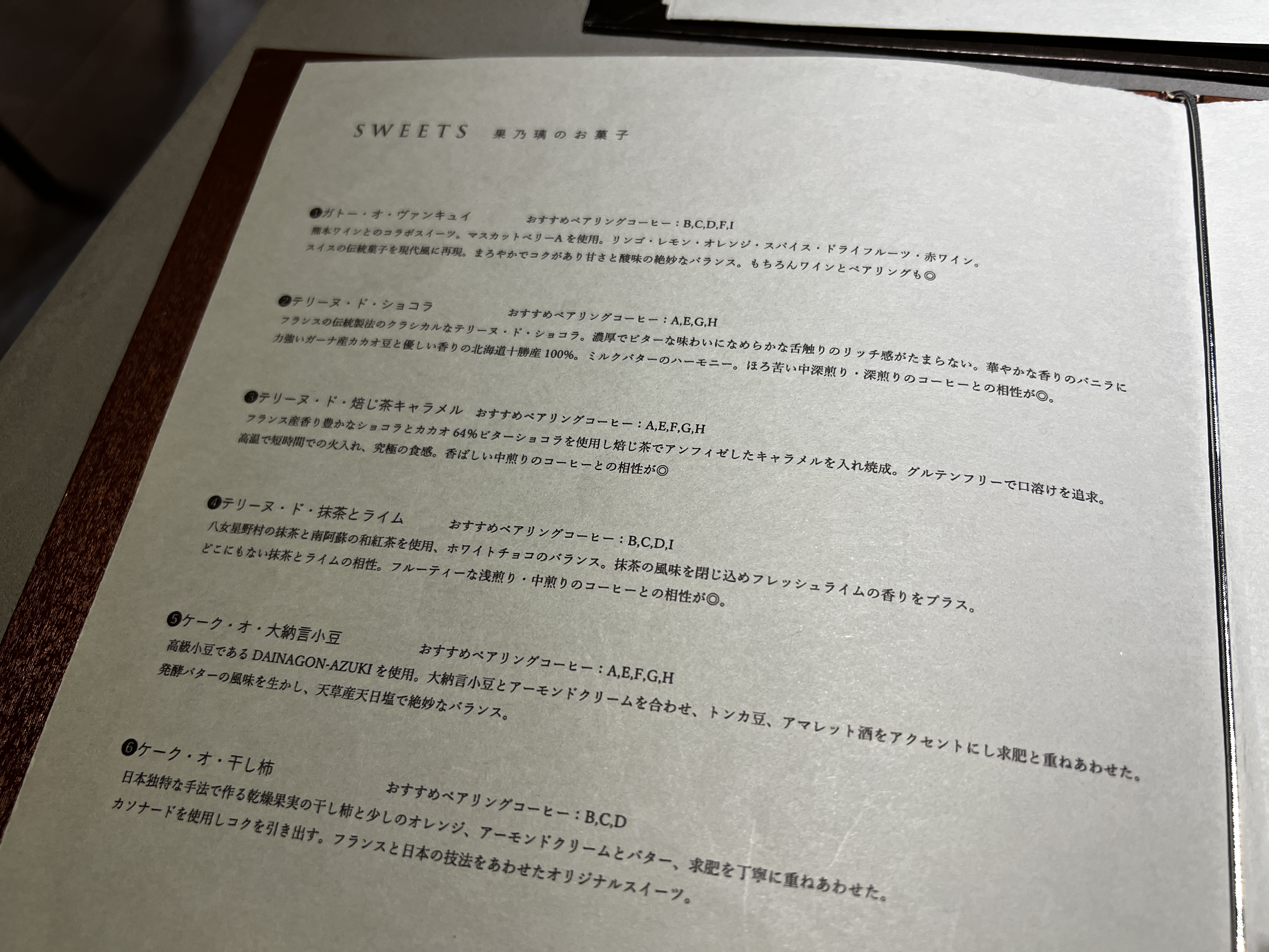 メニューひとつとっても豊かな味の表現と、コーヒー好きにもスイーツ好きにも選びやすいペアリングの提案がしてあり、菊井さんのお人柄が感じられます。
