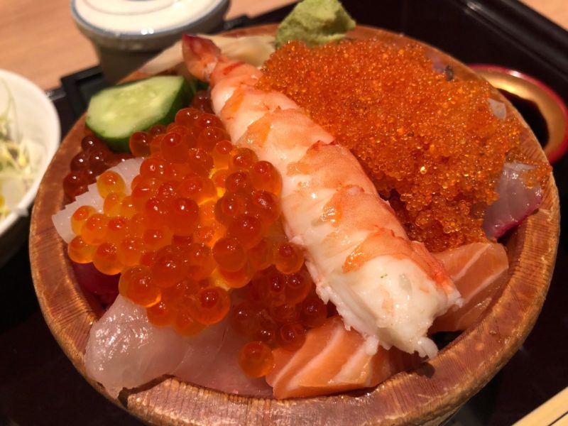 カンパチやマグロにイカ、ホタテなど、7種類の具材がごろごろ入っていて、豪華極まりない海鮮丼です。