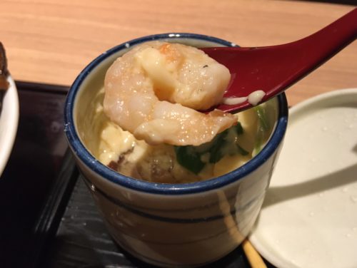 中には、大きな椎茸やプリップリの海老、さらに銀杏にいたっては、2個も入っていて、茶碗蒸しの中にもお宝いっぱい!ほとんど具材が入っていない、形ばかりの茶碗蒸しもよくありますが、こちらの茶碗蒸しの素晴らしさに胸打たれました。