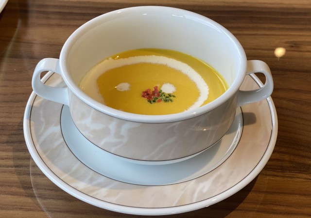 クリマロンの冷製スープ(クリマロンは栗ではなくかぼちゃの一種らしい)はあっさりしていて、それでもしっかりとかぼちゃの味があり夏にはもってこいの一品です。