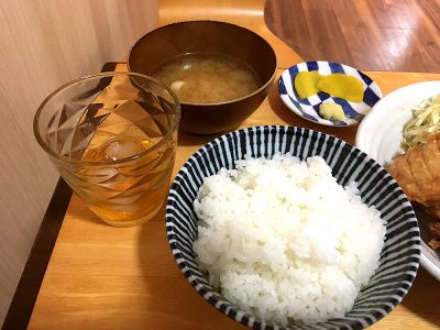 ご飯も+100円で大盛りご飯にしたのですが、なかなかの量。それとお味噌汁、キャベツ、たくあんです。