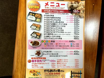 店内にあったチラシメニューを見ると、唐揚げ100gで180円はなかなかのお得!こちらは税込価格です。