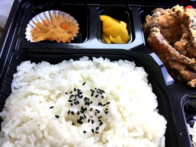 からあげ弁当が420円!ご飯が中盛りでもたっぷりで、唐揚げだけでなく、きちんときんぴらや漬物などの副菜もしっかり付いています。