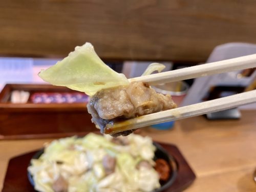 鉄板焼肉の大きな特徴は少し傾けて食べること。端っこに落ちた脂がキャベツとあわさって相当美味になるんです。
