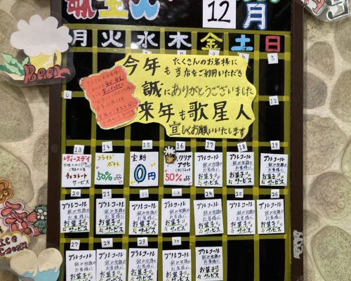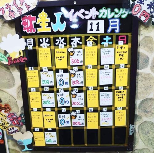 と、中へ入るとイベントカレンダーが!え?!毎日サービスしてるじゃん。サービス祭りのカレンダー見たこと無い。店長に話を聞いてみましょう。