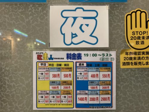 夜もお得に楽しめることが分かったところで、本題へ。熊本市内にあるカラオケ5店舗の週末夜のフリータイム【ソフトドリンクバー飲み放題】の平均(一般料金)2361.6円でしたよね。ここ「カラオケ歌星人」の料金表を見てみると週末は、フリータイムに+400円ドリンク飲み放題付き。なので、1880円!!!県内数々のカラオケ店の平均より480円強もお得。店長が言われていたように日・祝に来ればさらにお得、ドリンクも持って来てくれるって神すぎ。持ち込みもOK!なんだそう。