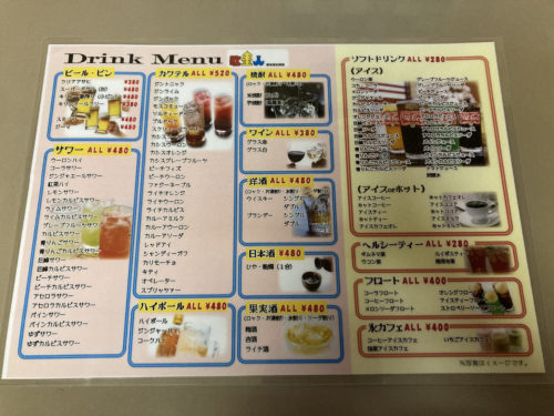まずは、ドリンクですよね。ソフトドリンクは280円。お酒も充実しています。持って来てくれるのもありがたい。