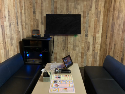 こちらが6名入れるお部屋。こちらで歌っていきます。DAMとJOYSOUNDの最新人気機種が設置されています。