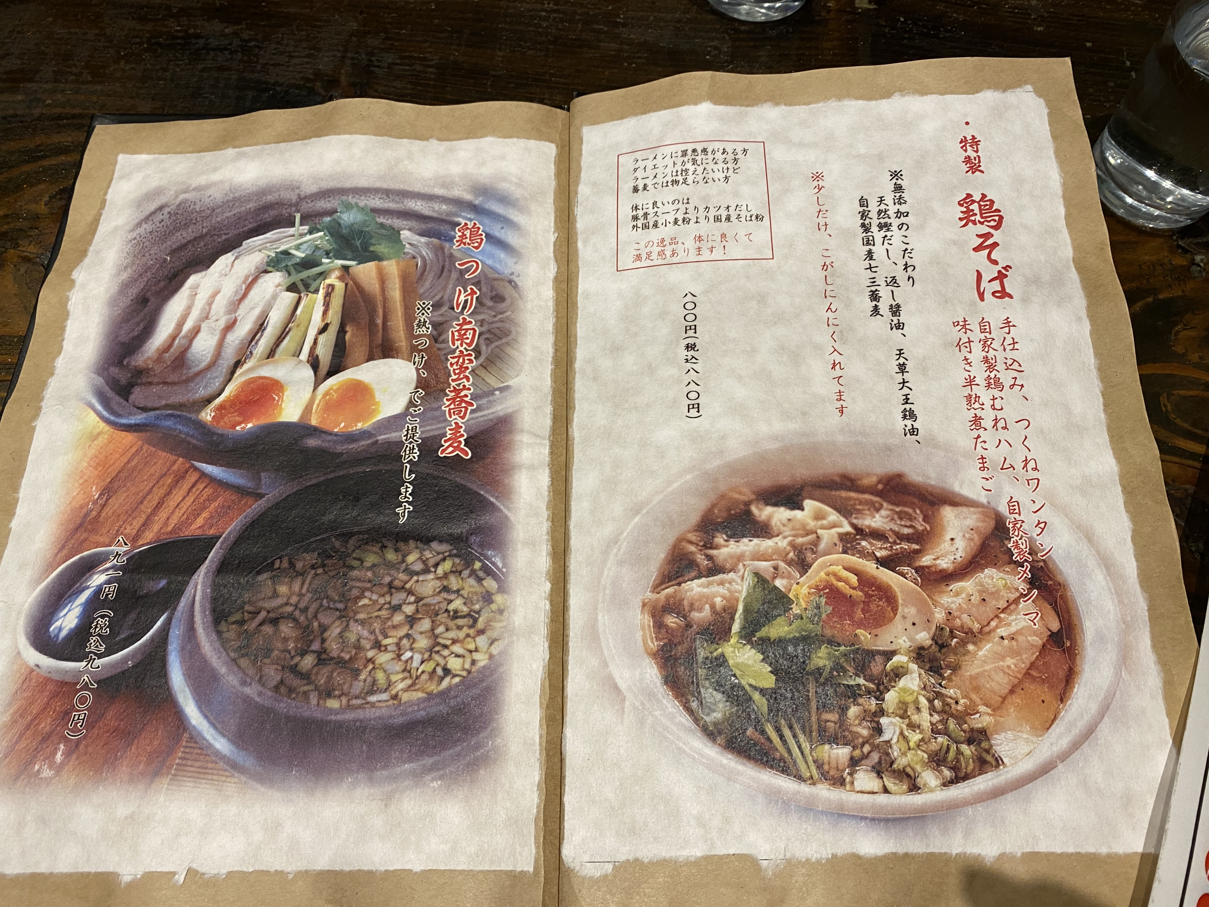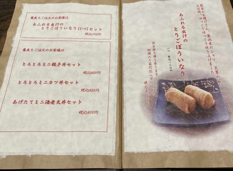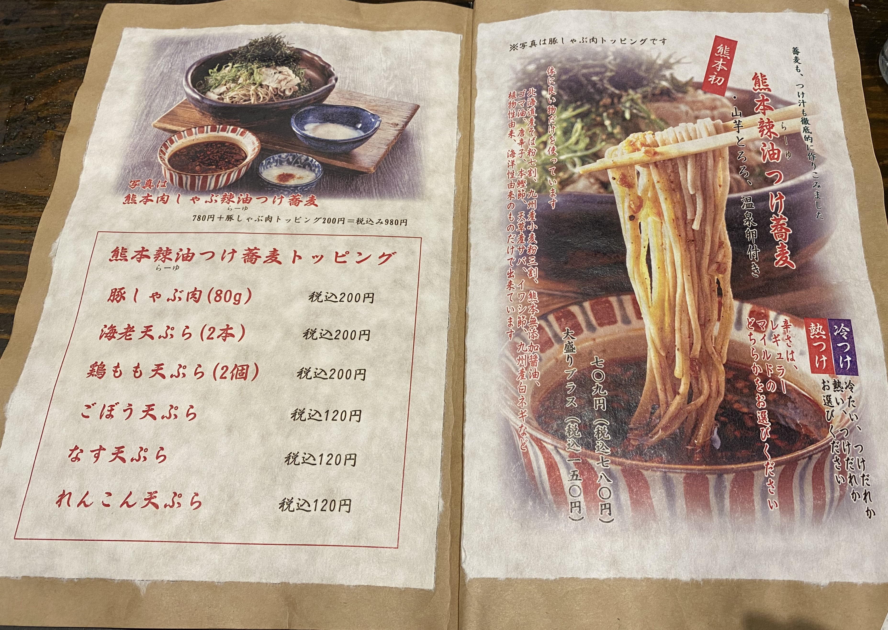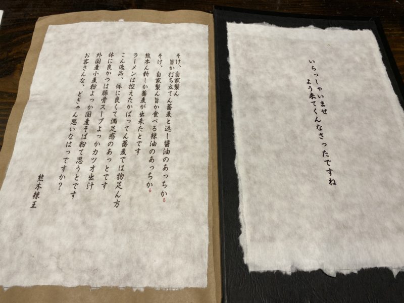メニューを開くと熊本弁で「ラーメンは控えたかばってんが、蕎麦じゃ物足らん」て。
