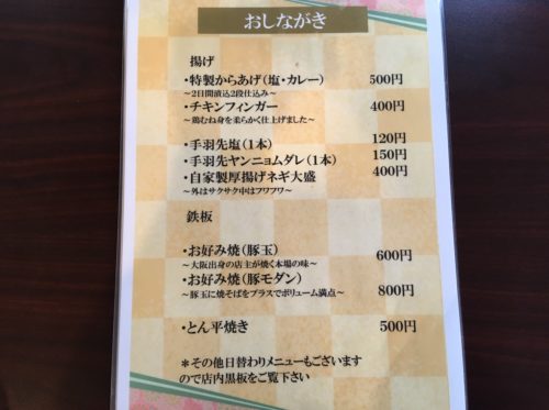 からあげのほかに、お好み焼きがあったり、お酒が飲めたり、おつまみメニューがあったりと、昼も夜も利用できるお店です。