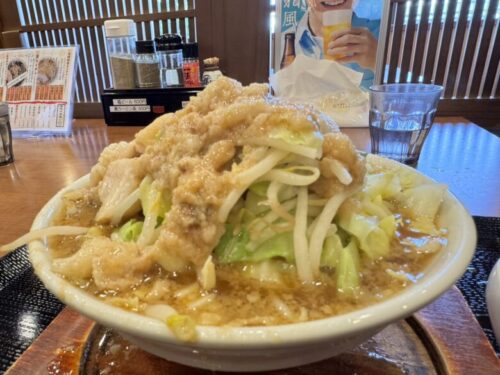 どっさりと盛られた野菜の上にたっぷりのアブラ。
