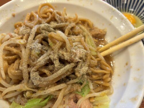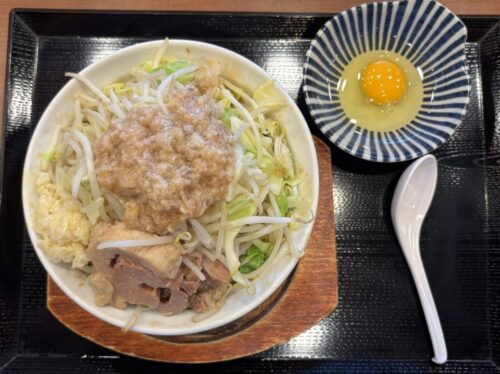 麺量は特盛の野菜・アブラマシ、肉基本、ニンニク基本、たまご(汁なしは無料で生卵か温玉が選べます。)