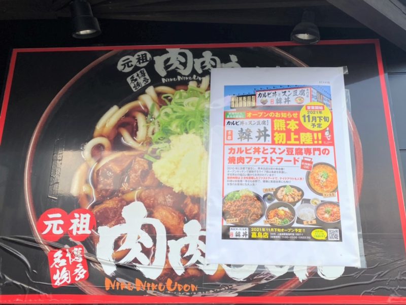 ☑肉肉うどん跡地には熊本発上陸の「カルビ丼とスン豆腐 韓丼 熊本嘉島店」オープンは11月30日。