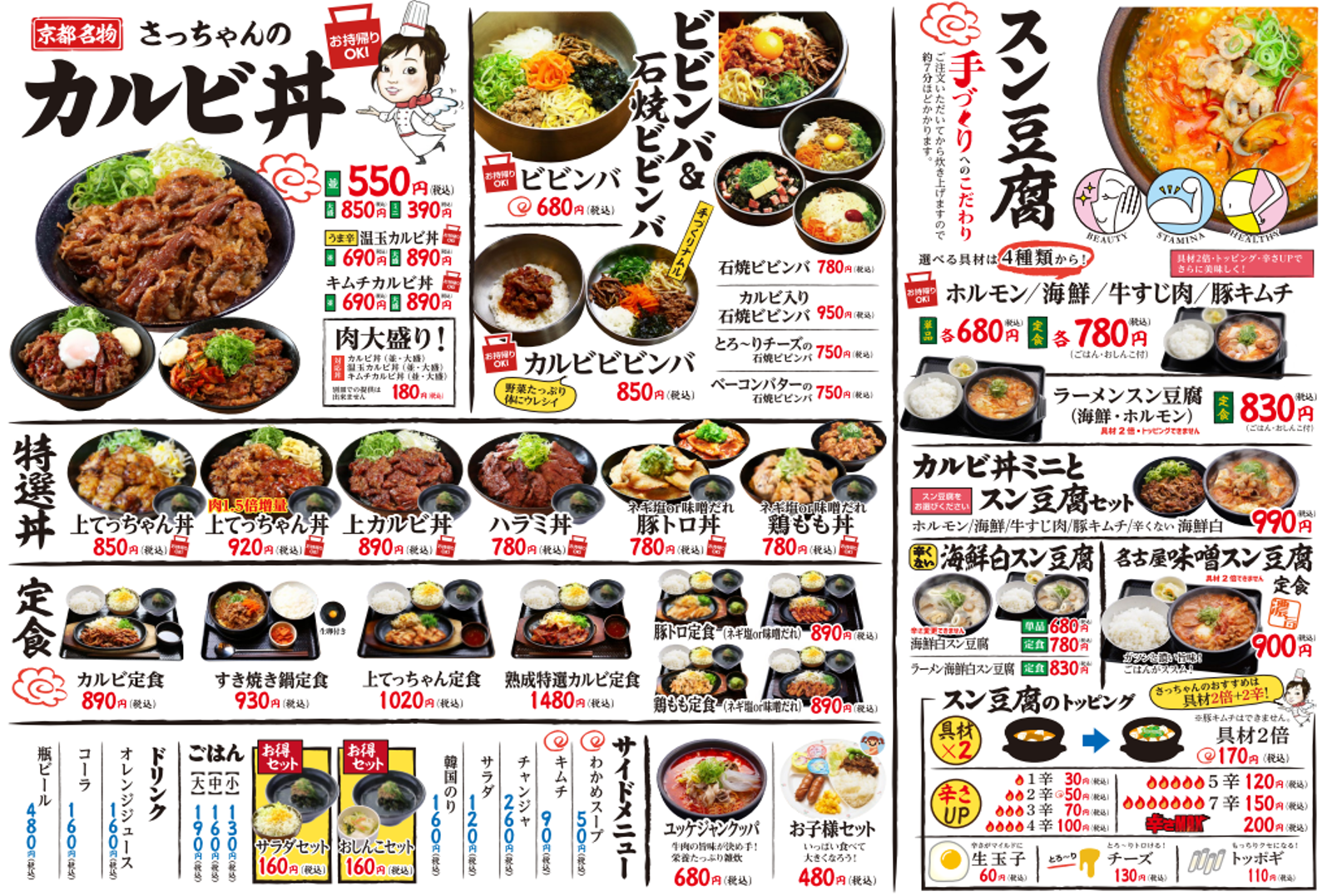 こちらメニュー!カルビ丼とスン豆腐が2大名物で、その他にもこんなに美味しそうなメニューがたくさんあります!これ迷っちゃうやつですね。