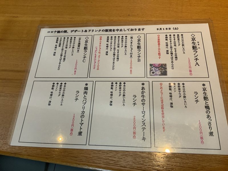 ランチは日替わりで6種類。旬の食材を使った和食が中心で、今回は京生麩ランチA(税込1200円)を注文しました!
