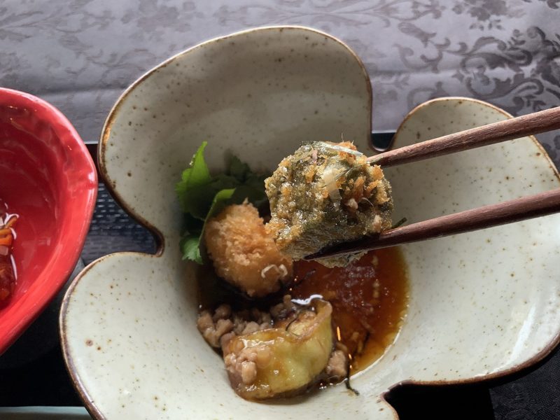こちらは「なまふと茄子の鶏そぼろあんかけ」。ふわっふわの生麩に出汁が染みて最高です。