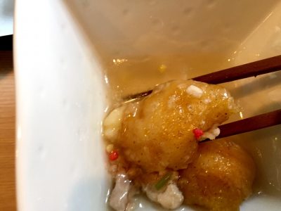 美人まんじゅうは餡の味ジャガ芋の中に、ひき肉を入れて揚げ、あんかけした物でジャガイモの食感と餡が絶妙に美味しいです。