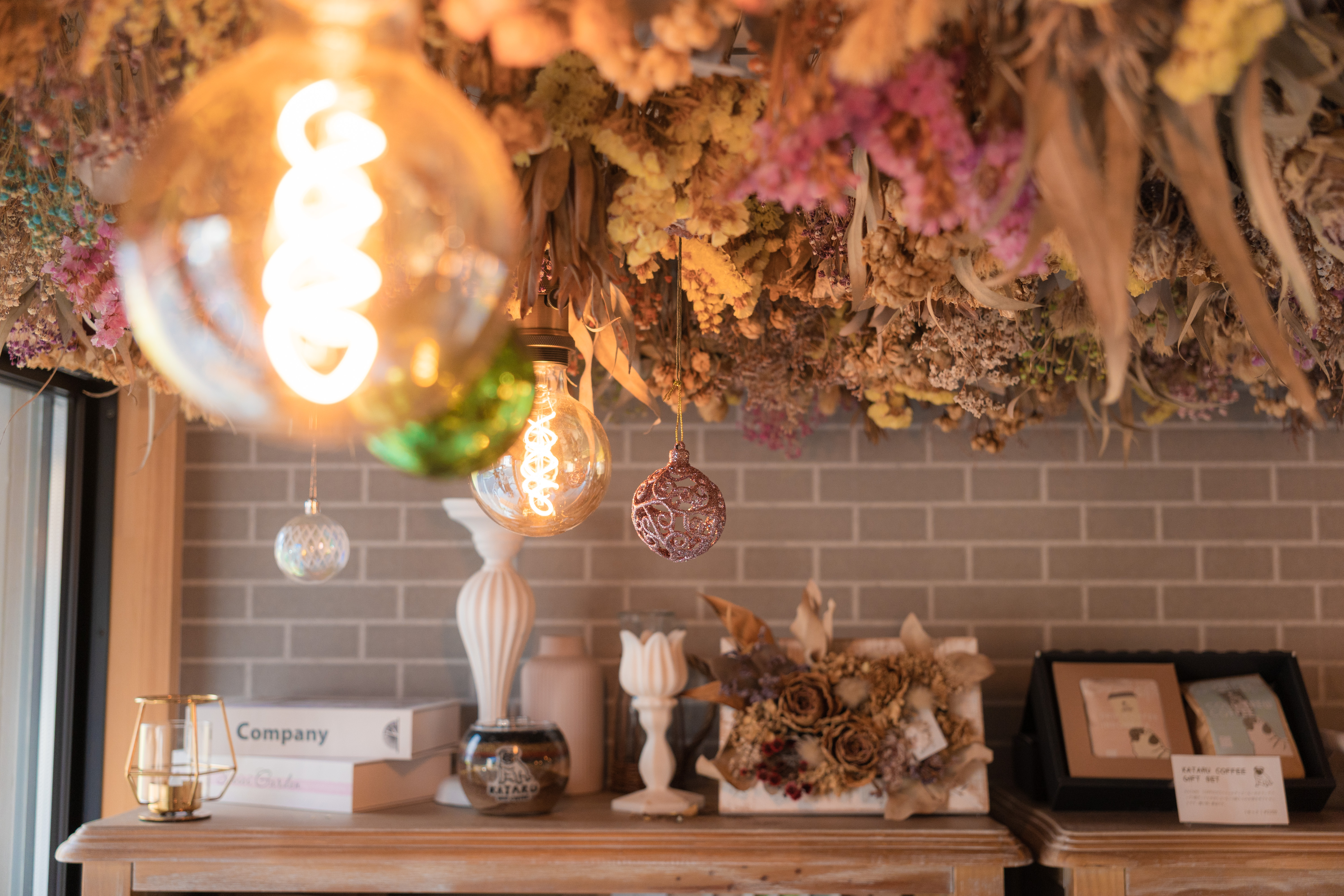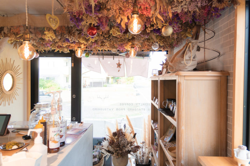 ドライフラワーが広がる天井が印象的な店内