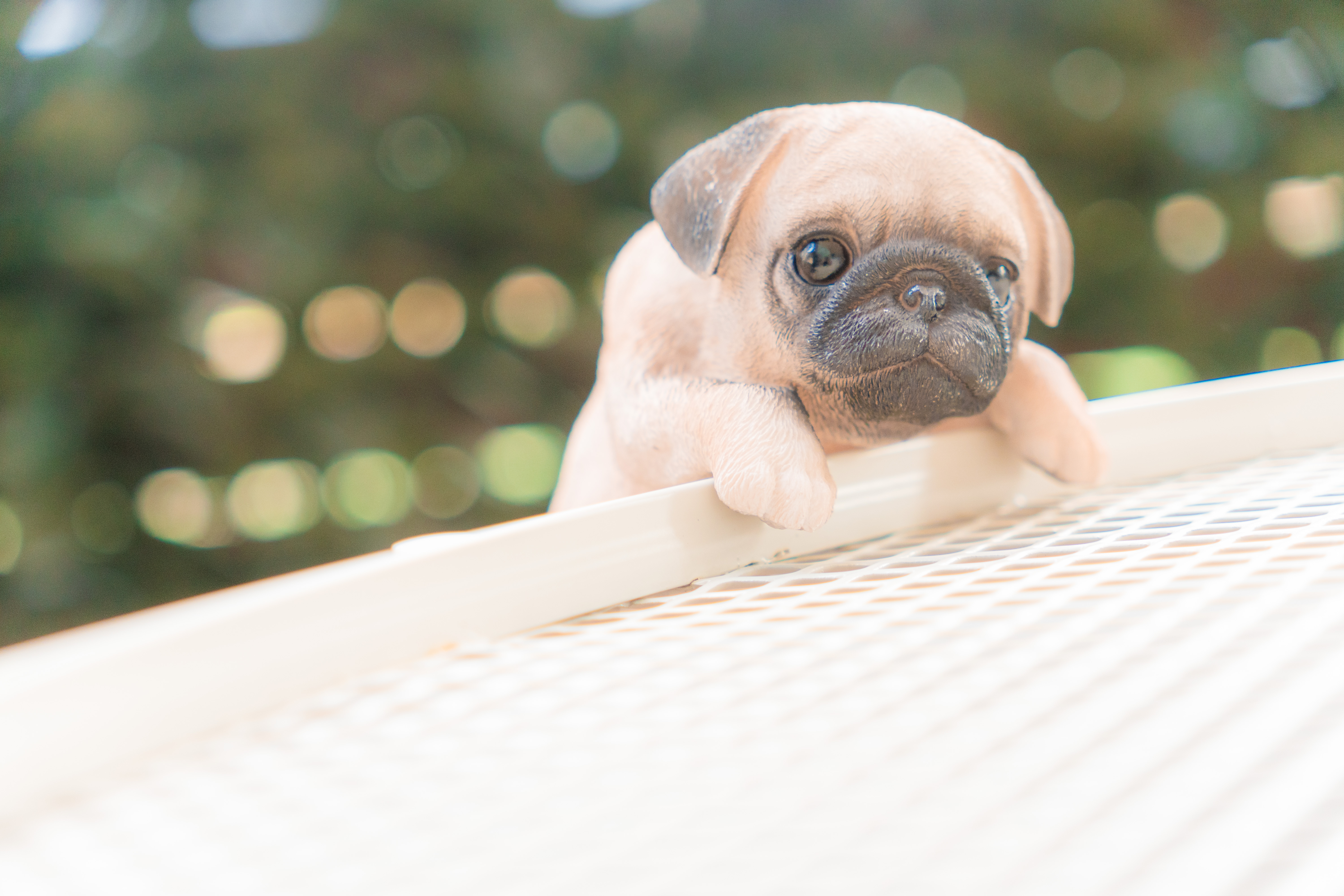 テーブルにはまるで構ってほしいかのような目で見つめているパグの置物。