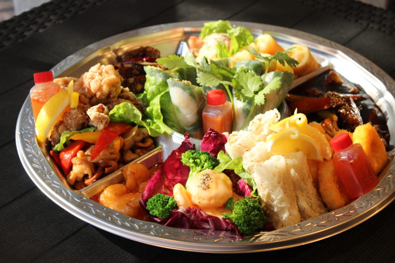 色とりどりのアジアンメニューが詰まったオードブルは、ハーブやスパイスの香りが食欲をグイグイ刺激してきます。写真は11,000円(6〜8人前)。家族みんなで食べてもお腹いっぱい!