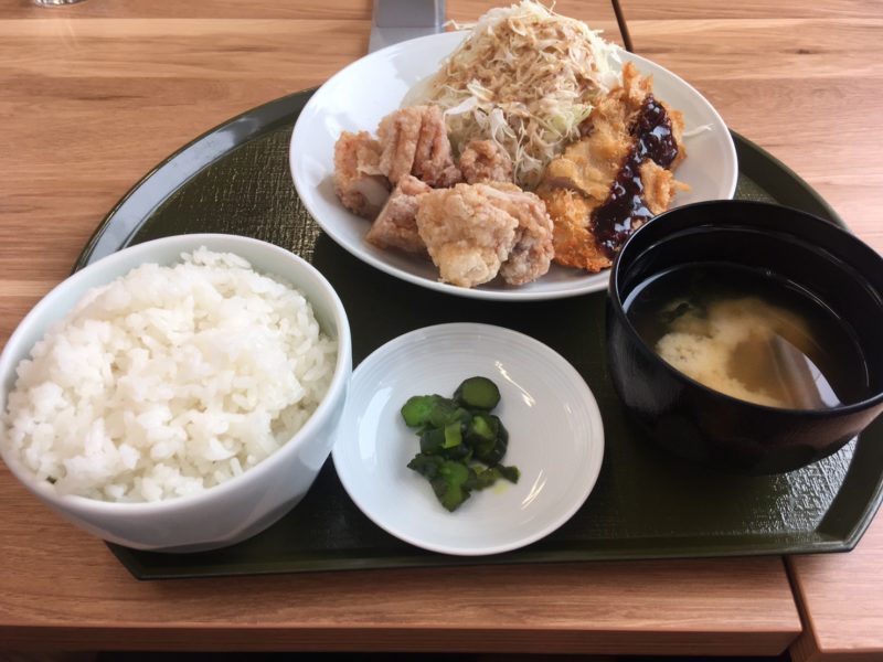 唐揚げやカツもカラッと揚げられていて、ソースや辛子、ドレッシングや塩などはテーブルに置いてあるので、お好みで利用できます。子どもを連れて行ったところ、唐揚げはわざわざ切って出してもらえて、その優しさにも感動です。