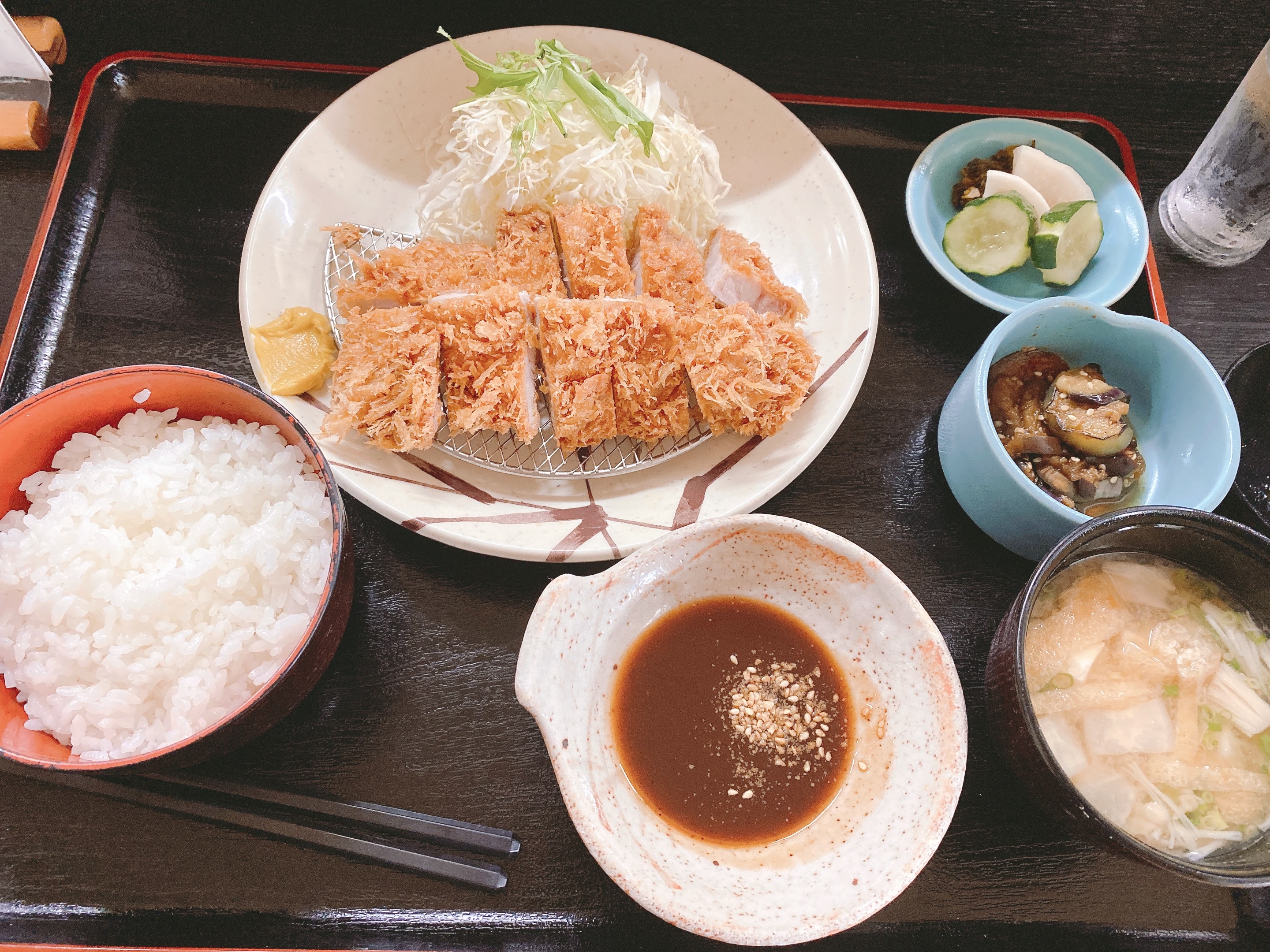 ご飯、白みその味噌汁、野菜、とんかつ、小鉢、お漬物。